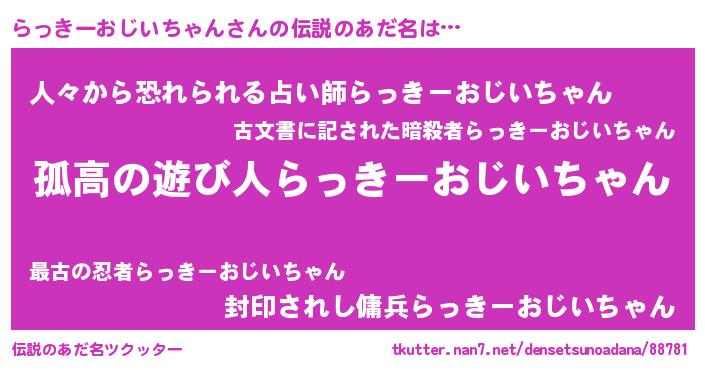 | 男性向けラノベタイトル風あだ名 | 『魔弾の王とらっきーおじいちゃん』 |