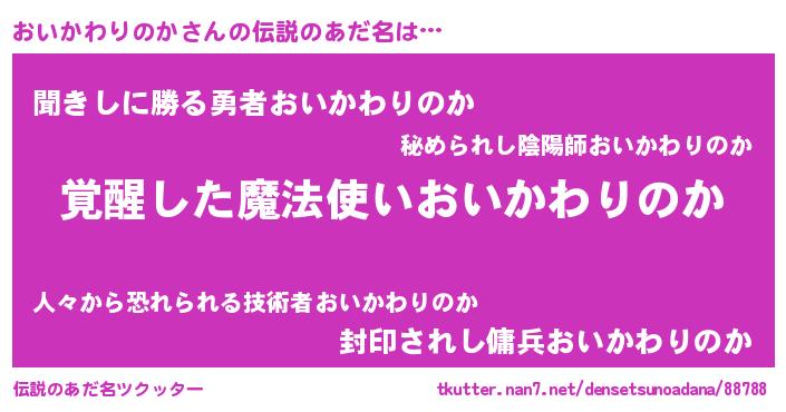 | ヒーロー風カッコイイあだ名 | 『炎刃騎士オイ』『ネオオイカワリノカ』 |