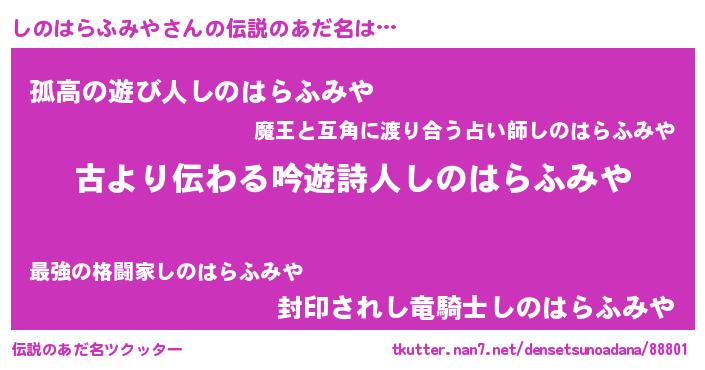 | ヘコむあだ名 | 『しのはらふみや(小並感)』『しのお』 |