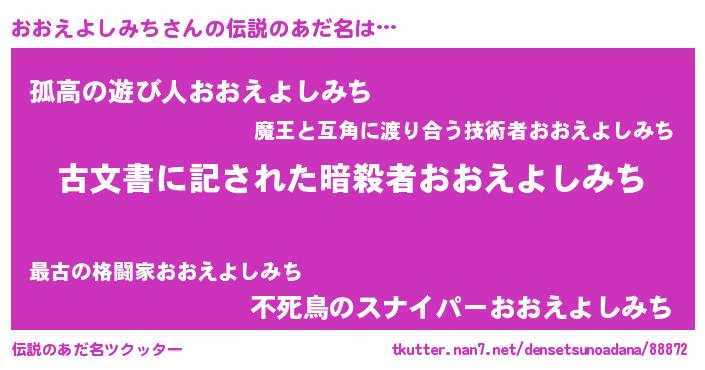 | 男性向けラノベタイトル風あだ名 | 『おおえよしみちに滅ぼされるだけの簡単なお仕事です』 |