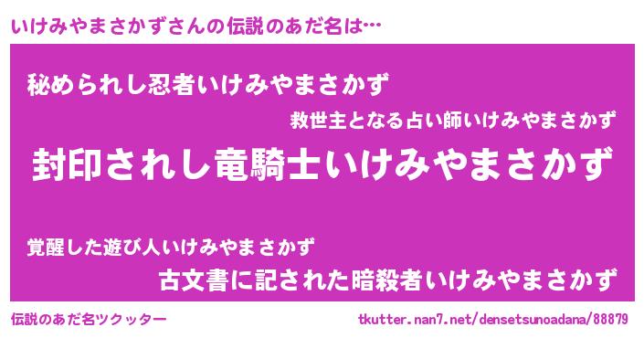 | 男性向けラノベタイトル風あだ名 | 『いけみやまさかず~年齢イコール彼女いない歴の魔法使い~』 |