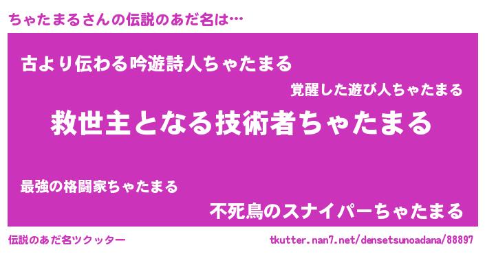 | 男性向けラノベタイトル風あだ名 | 『ちゃたまる~年齢イコール彼女いない歴の魔法使い~』 |
