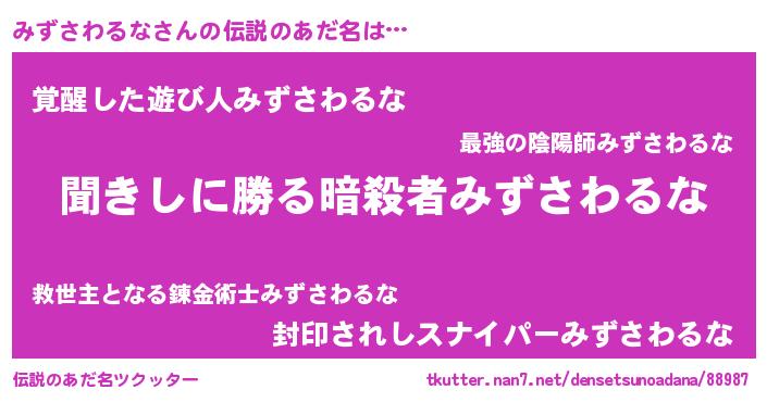 | ヒーロー風カッコイイあだ名 | 『ネオミズサワルナ』『炎刃騎士ミズ』 |