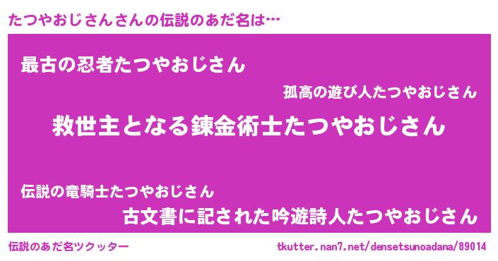 | 男性向けラノベタイトル風あだ名 | 『たつやおじさんに滅ぼされるだけの簡単なお仕事です』 |