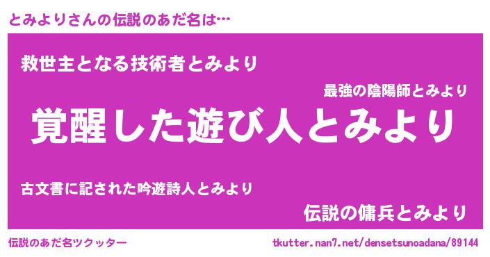 | 男性向けラノベタイトル風あだ名 | 『とみより~年齢イコール彼女いない歴の魔法使い~』 |