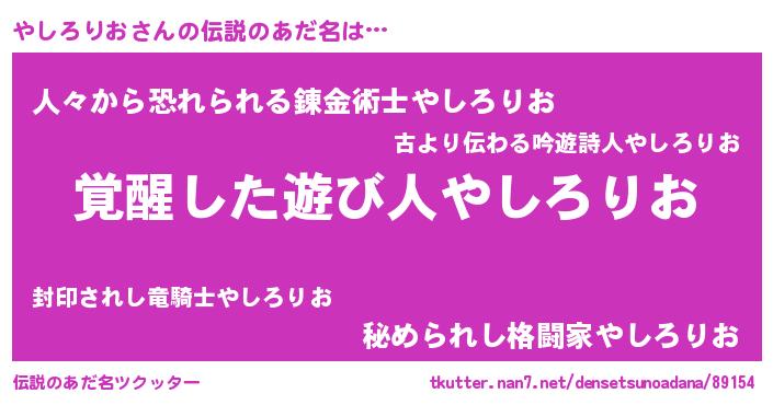 | ヒーロー風カッコイイあだ名 | 『天弓騎士ヤシ』『正義の使者やしろりお』 |