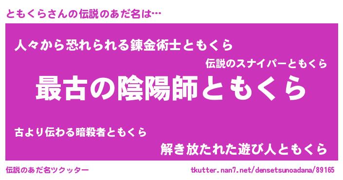 | 意味不明あだ名 | 『住所不定無職ともくら(89歳)』 |