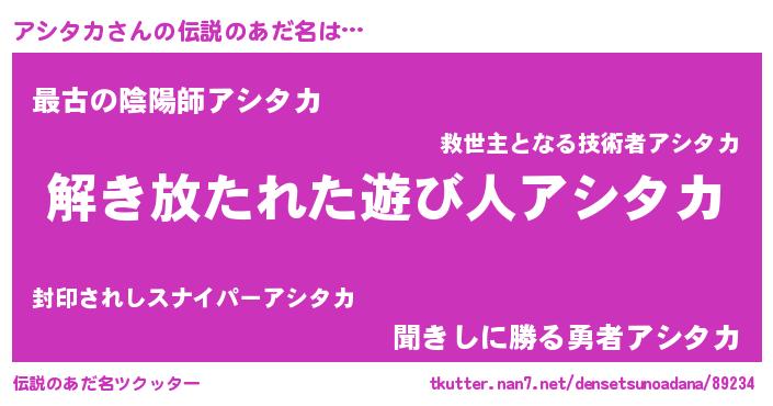 | ヒーロー風カッコイイあだ名 | 『幻影騎士アシ』『ウルトラアシタカマン』 |
