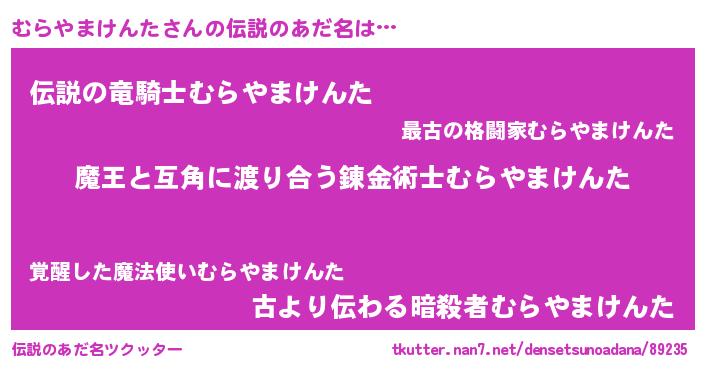 | 男性向けラノベタイトル風あだ名 | 『魔弾の王とむらやまけんた』 |
