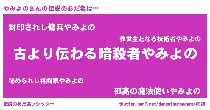 | 男性向けラノベタイトル風あだ名 | 『やみよのという概念が存在しない退屈な世界 』 |