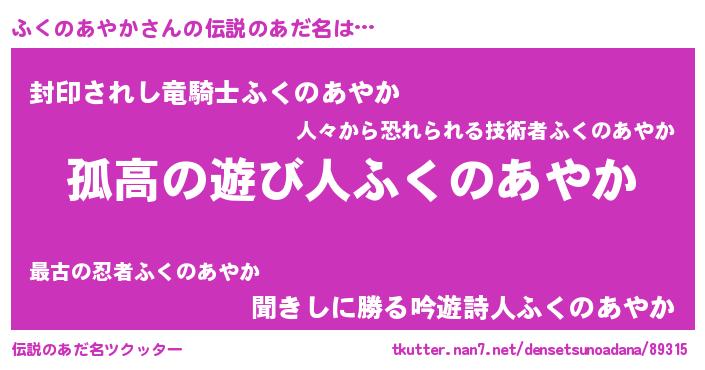 | ヒーロー風カッコイイあだ名 | 『暗黒騎士フク』『スーパーフクノアヤカ』 |