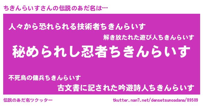 | 女子向けラノベタイトル風あだ名 | 『ちきんらいすが死なない童話 林檎のちきんらいすの診療簿』 |