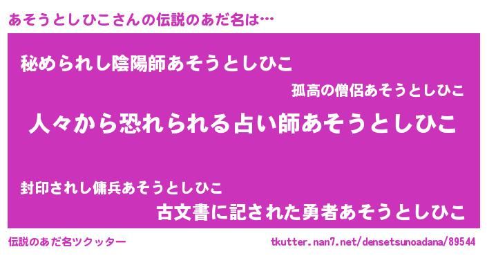 | 男性向けラノベタイトル風あだ名 | 『アソウトシヒコスレイヤー』 |