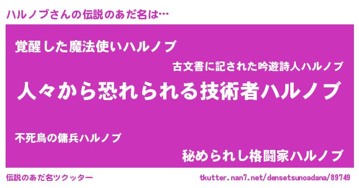 | 男性向けラノベタイトル風あだ名 | 『ハルノブスレイヤー』 |