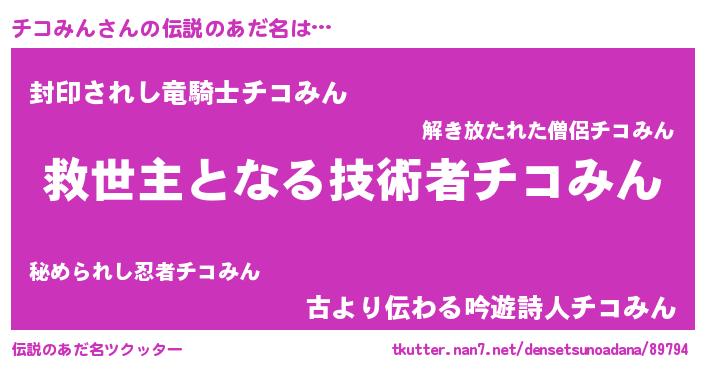 | 男性向けラノベタイトル風あだ名 | 『Re:チコみんから始める異世界生活』 |