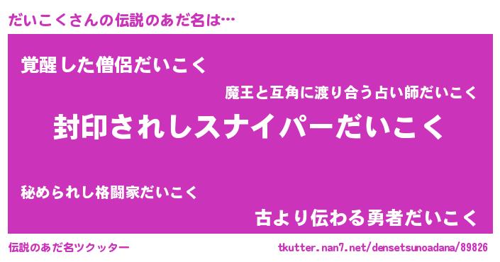 | 男性向けラノベタイトル風あだ名 | 『だいこく~年齢イコール彼女いない歴の魔法使い~』 |