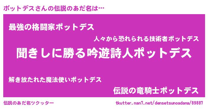 | ヘコむあだ名 | 『ポットデス(小並感)』『酢こんぶ』 |