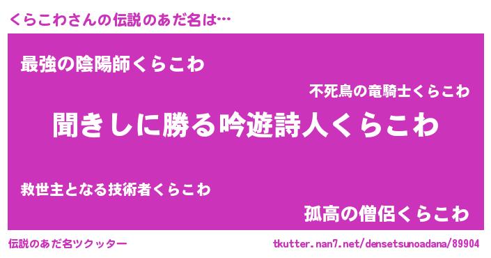 | 男性向けラノベタイトル風あだ名 | 『くらこわという概念が存在しない退屈な世界 』 |