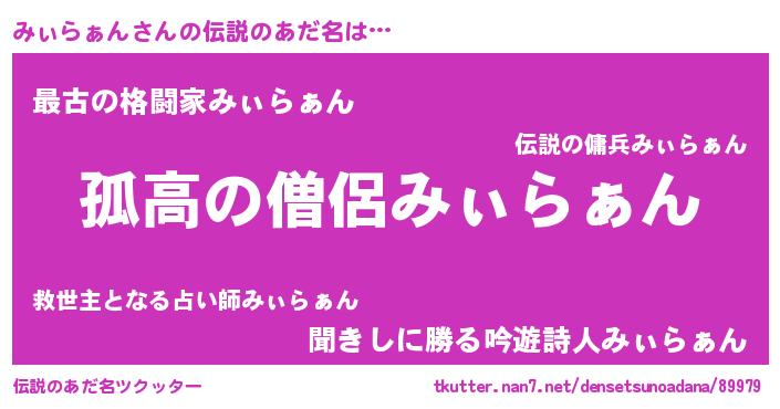 | 男性向けラノベタイトル風あだ名 | 『ミィラァンスレイヤー』 |