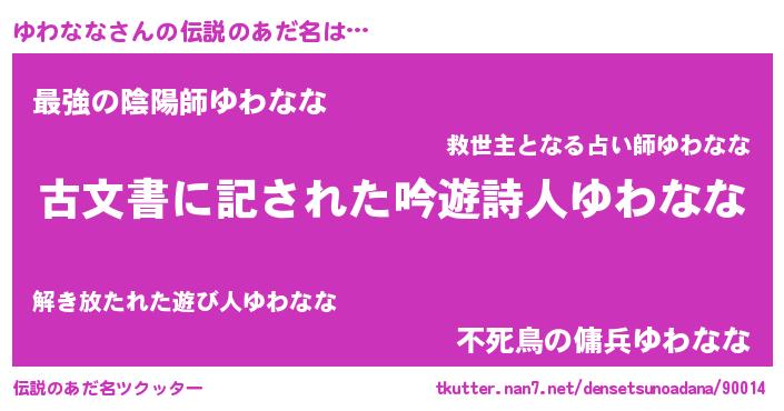 | ヒーロー風カッコイイあだ名 | 『ネオユワナナ』『ウルトラゆわななマン』 |