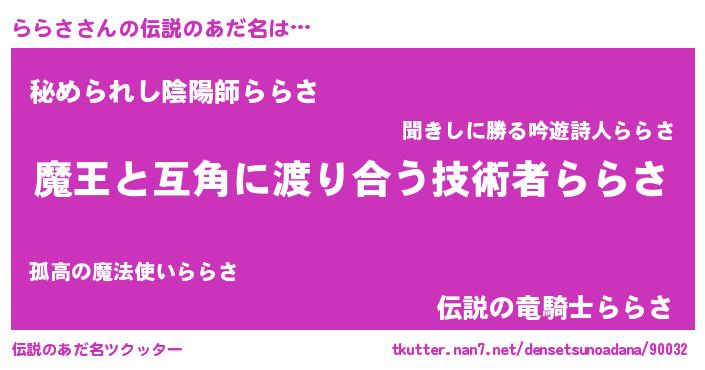 | ヒーロー風カッコイイあだ名 | 『慈愛の使者ららさ』『スーパーララサ』 |