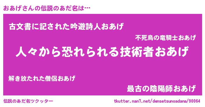 | ヒーロー風カッコイイあだ名 | 『正義の使者おあげ』『ネオオアゲ』 |