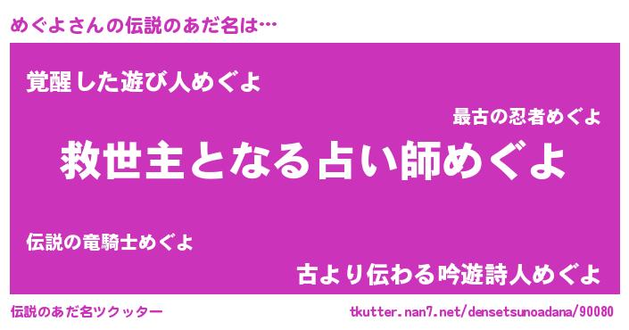 | 女子向けラノベタイトル風あだ名 | 『死神めぐよの再婚』『めぐよの契約王妃』 |