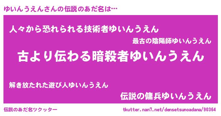 | 男性向けラノベタイトル風あだ名 | 『Re:ゆいんうえんから始める異世界生活』 |