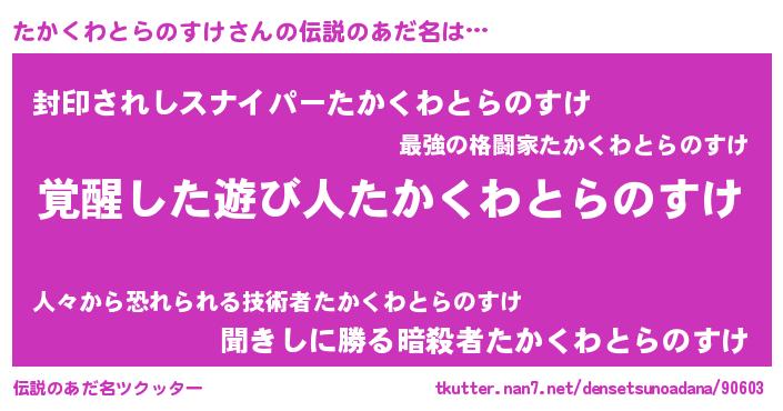 | ヒーロー風カッコイイあだ名 | 『最強戦士タカクワトラノスケ』 |