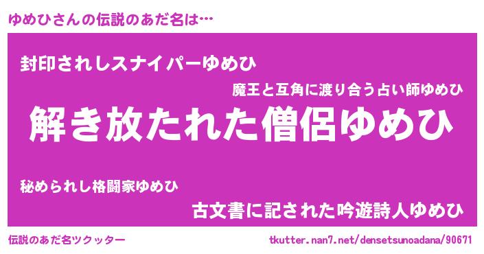 | ファンタジー風あだ名 | 『ユリユメヴァット』『ファントムユメス』 |