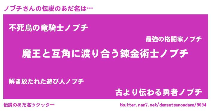 | 男性向けラノベタイトル風あだ名 | 『ノーゲーム・ノーノブチ』 |