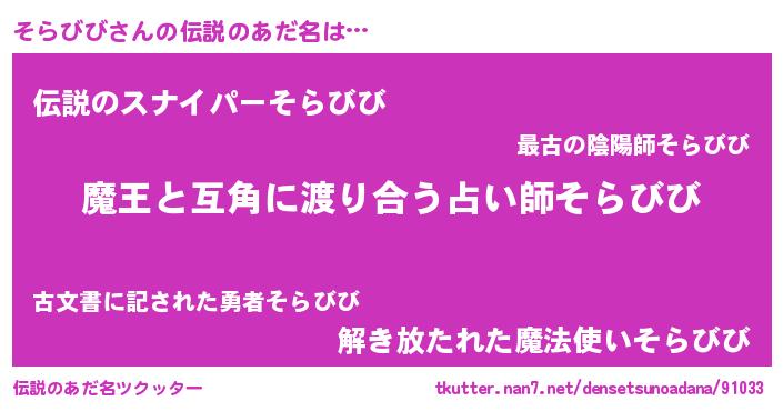 | 男性向けラノベタイトル風あだ名 | 『おまえをオタクにしてやるから、俺をそらびびにしてくれ! 』 |