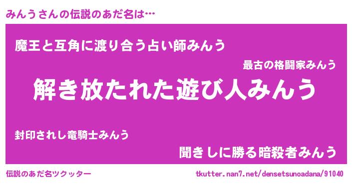 | ヒーロー風カッコイイあだ名 | 『魔戒騎士ミン』『正義の使者みんう』 |