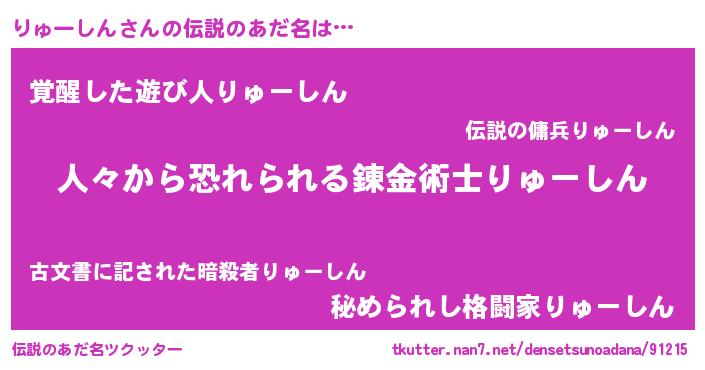 | ヒーロー風カッコイイあだ名 | 『正義の使者りゅーしん』『天弓騎士リュ』 |