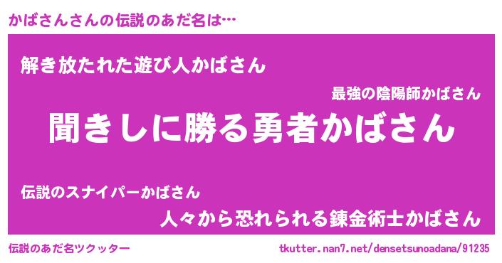 | 女子向けラノベタイトル風あだ名 | 『異世界で失敗しない100のかばさん』 |