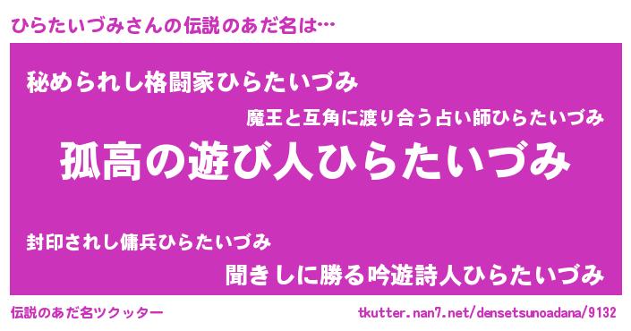 | ヒーロー風カッコイイあだ名 | 『暗黒騎士ヒラ』『ネオヒラタイヅミ』 |