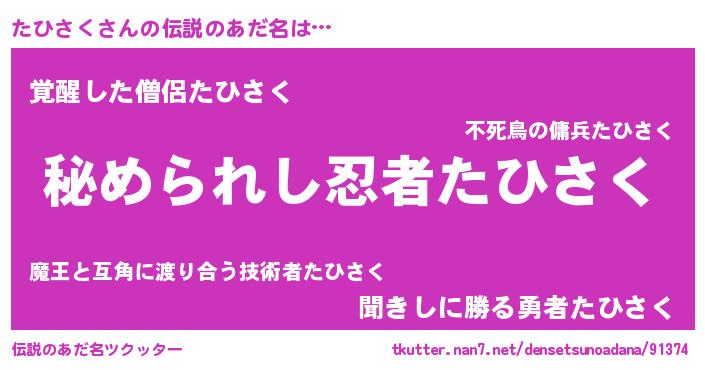 | ヒーロー風カッコイイあだ名 | 『ウルトラたひさくマン』『黄金騎士タヒ』 |