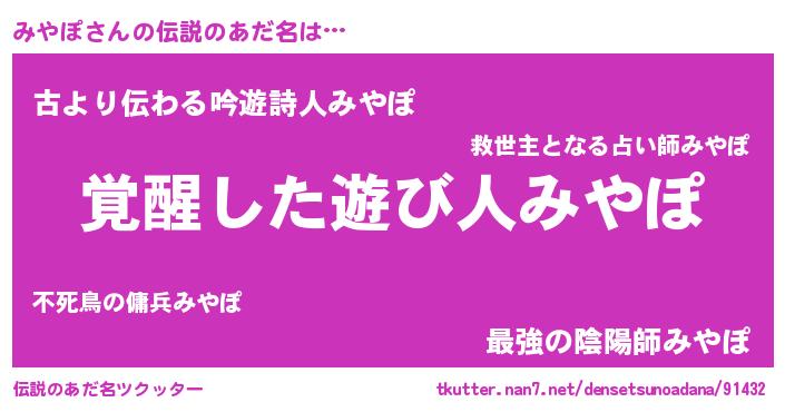 | 女子向けラノベタイトル風あだ名 | 『みやぽストレイドッグス』 |