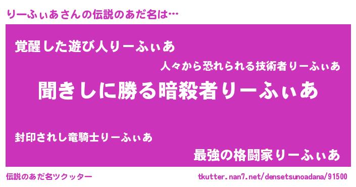 | 意味不明あだ名 | 『自称りーふぃあ』『永久保存りーふぃあ』 |