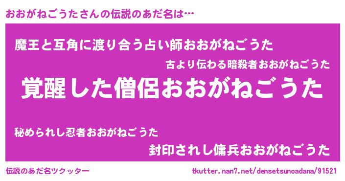 | 男性向けラノベタイトル風あだ名 | 『おおがねごうたの嫁は女の子じゃないと思った?』 |