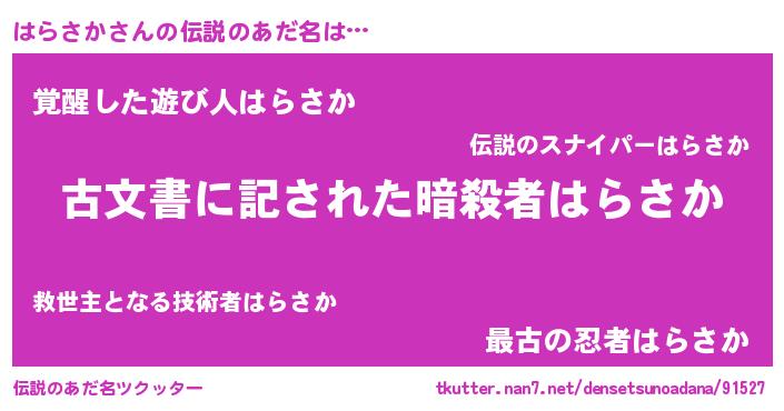 | ヒーロー風カッコイイあだ名 | 『ネオハラサカ』『黄金騎士ハラ』 |