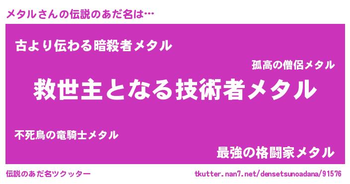 | 女子向けラノベタイトル風あだ名 | 『死神メタルの再婚』 |