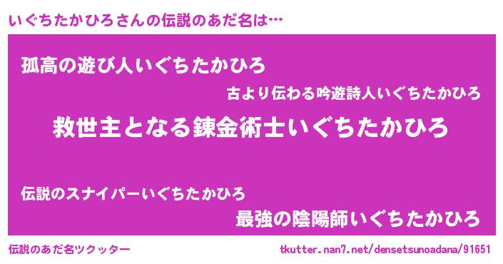 | 男性向けラノベタイトル風あだ名 | 『うちのいぐちたかひろが世界を掌握している!』 |