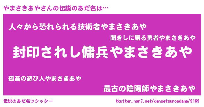 | 男性向けラノベタイトル風あだ名 | 『やまさきあや~年齢イコール彼女いない歴の魔法使い~』 |