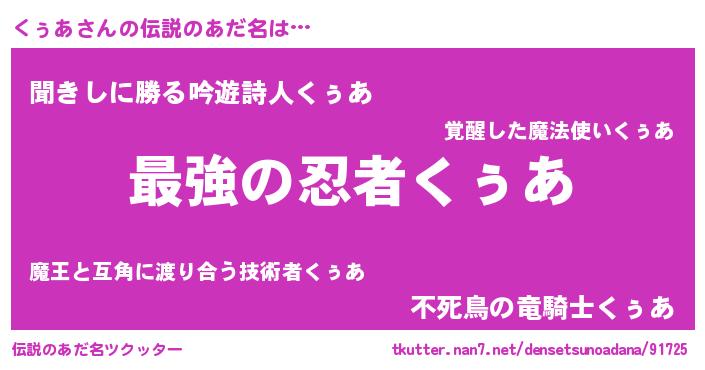 | 男性向けラノベタイトル風あだ名 | 『この素晴らしい世界にくぅあを!』 |