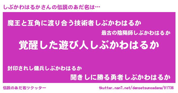 | 意味不明あだ名 | 『とにかく怪しいしぶかわはるか』 |