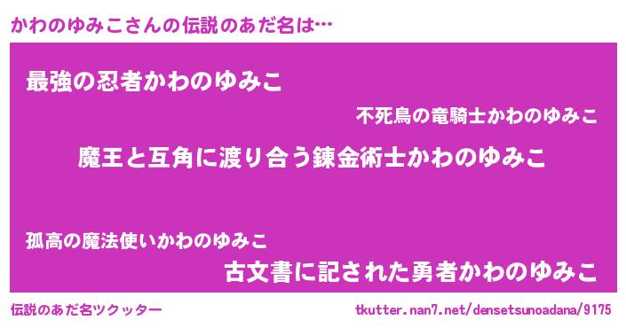 男性向けラノベタイトル風あだ名 | 『ノーゲーム・ノーカワノユミコ』 |