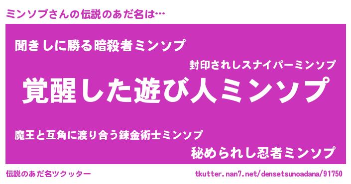 | 男性向けラノベタイトル風あだ名 | 『ミンソプの嫁は女の子じゃないと思った?』 |