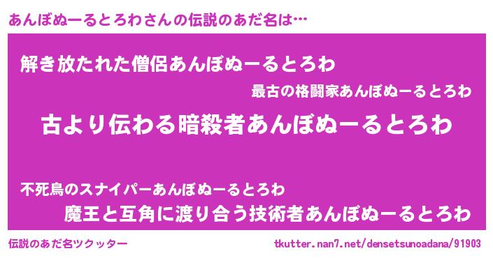 | 意味不明あだ名 | 『住所不定無職あんぼぬーるとろわ(39歳)』 |
