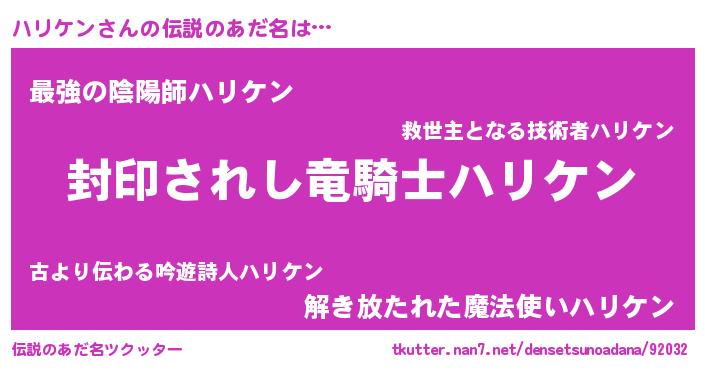 | 男性向けラノベタイトル風あだ名 | 『ハリケンアートオンライン』 |